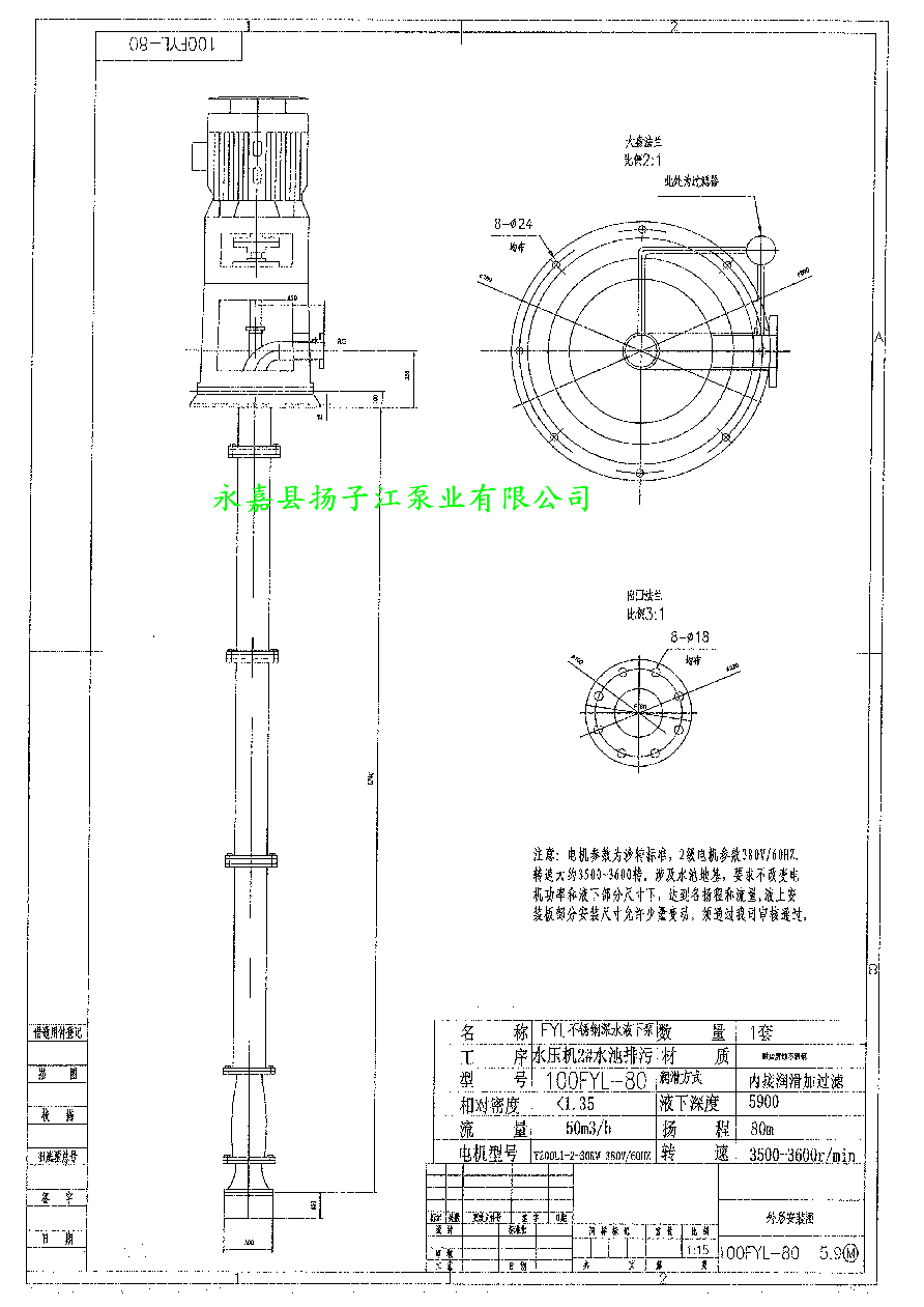 380V/60HZ揚程80米316L材質液下泵液下長度5.9米結構圖