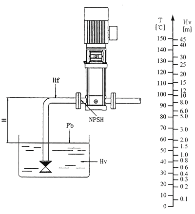 如果泵中的壓力低于輸送液體的蒸汽壓力、可能發生氣蝕,確保泵進口側有一小壓力,大吸程H[m]可按下式計算: