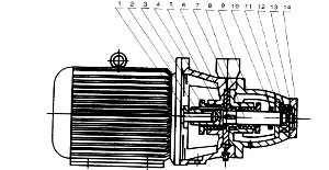 泵體4與電機法蘭連接,泵軸8裝在電機軸頭上是動配合,鍵2在鍵槽內可自由滑動。