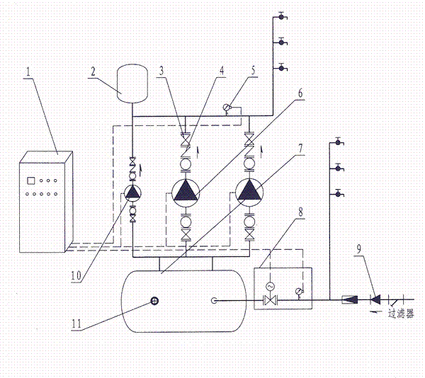 供水設備是我公司技術人員結合多年管網疊壓供水設備研究經驗設計而成的新一代智能型成套無負壓穩流給水設備,采用智能變頻控制柜控制。其組成及工作原理如下圖: