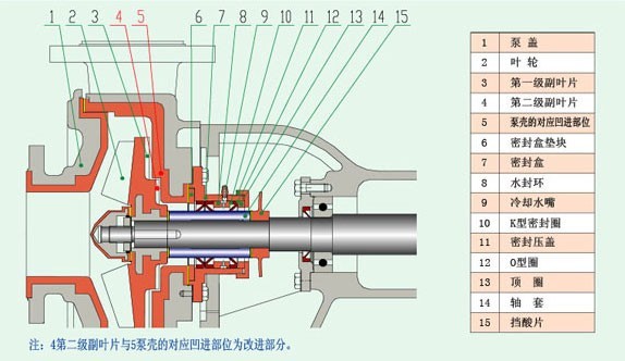 UHB-ZK-AB型耐腐耐磨泵是對(duì)UHB-ZK-A系列泵的改進(jìn)型泵(見(jiàn)上圖)。兩者之間的區(qū)別在于后者是無(wú)臺(tái)階式背葉片,前者為臺(tái)階式背葉片結(jié)構(gòu)(見(jiàn)圖中序號(hào)4)。改進(jìn)后的葉輪的背葉分為二級(jí),二級(jí)背葉片之間有凸起臺(tái)階。與之相匹配的泵也有凹進(jìn)的臺(tái)階。設(shè)置背葉輪臺(tái)階的目的是阻斷泵出口流體壓力對(duì)軸密封的返流壓力,保證和延長(zhǎng)軸密封的使用壽命。
