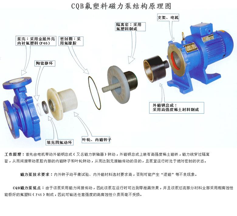 CQB型氟塑料磁力泵是應用現代磁力學原理,利用永磁體實現無接觸間接傳動的一種化工流程泵。當電機帶動外轉子(即外磁鋼)總成旋轉時,通過磁場的作用磁力線穿過隔離套帶動內轉子(即內磁鋼)總成和葉輪同步旋轉,介質完全封閉在靜止的隔離套內,從而達到無泄漏抽送介質的目的,徹底解決了機械傳動泵的軸封泄漏,氟塑料磁力泵,其過流部件全部采用氟塑料制造,設計合理,工藝先進,具有全密封,無泄漏,耐腐蝕性能極強等特點,其性能達到世界同類產品的先進水平,已廣泛替代進口磁力泵。