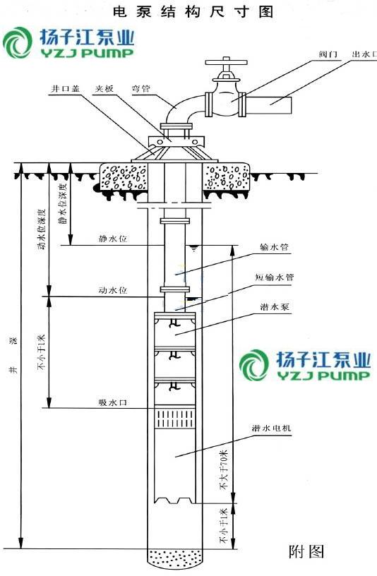 1.QJ型潛水電泵機組由:水泵、潛水電機(包括電纜)、輸水管和控制開關四大部分組成。潛水泵為單吸多級立式離心泵:潛水電機為密閉充水濕式、立式三相鼠籠異歩電動機,電機與水泵通過爪式或中.鍵筒式聯軸器直接;配備有不同規格的三芯電纜:起動設備為不同容量等級的空氣開關和自耦減壓起動器、輸水管為不同直徑的鋼管制成,采用法蘭聯接,高揚程電泵釆用閘閥控制。
