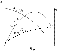 (2)離心泵的性能曲線 從前面的討論可以看出,對一臺離心泵,在轉(zhuǎn)速固定 的情況下,其壓頭、軸功率和效率都與其流量有一一對應(yīng)的關(guān)系。這些關(guān)系的圖形表示就稱為離心泵的性能曲線,包括qV-H曲線、qV-Pa曲線和qV-η曲線,這些關(guān)系一般都通過實(shí)驗來測定。 離心泵的特性曲線一般由離心泵的生產(chǎn)廠家提供,標(biāo)繪于泵產(chǎn)品說明書中,其測定條件一般是20℃清水,轉(zhuǎn)速也固定。典型的離心泵性能曲線如圖所示。