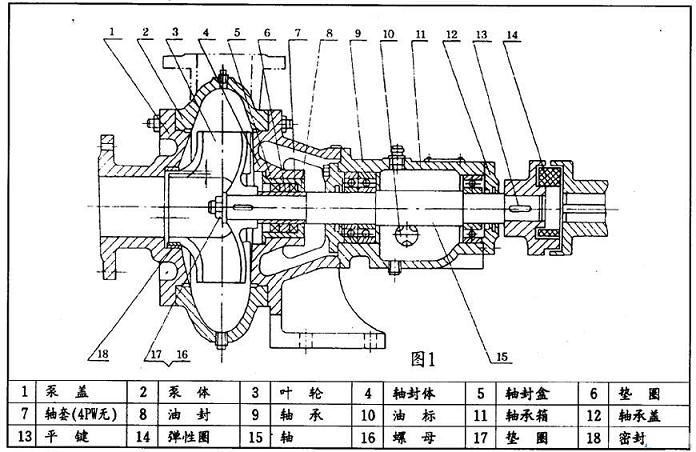 本型泵主要由:泵蓋(1),泵體(2),葉輪(3),軸(15),軸封體(4),軸承箱(11))及聯軸器部件等組成〈見圖1:結構圖〉