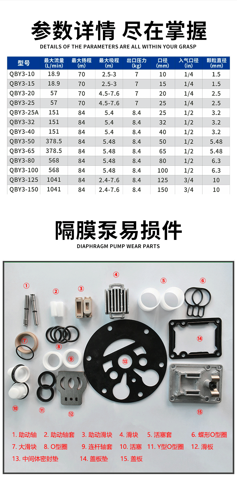 QBY系列氣動隔膜泵是一種新型輸送機械,是目前國內新穎的一種泵類。采用空氣壓縮機壓縮空氣為動力源,對于各種腐蝕性液體,帶顆粒的液體,高粘度、易揮發、易燃、劇毒的液體,均能予以抽光吸盡。其性能參數與聯邦德國的 WLLDENPVMPS、美國的MARIOWPUMPS相近.本廠目前已形成系列化生產