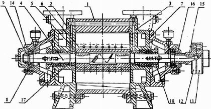 1.泵體 2.后蓋 3.前蓋 4.泵軸 5.平鍵 6.葉輪 7.軸承瓦架 8.滾珠軸承 9.園螺母 12.泵聯(lián)軸器 13.電機聯(lián)軸器 14.軸承蓋 15.鍵 16.定位圈 17.軸套 18.填料壓蓋