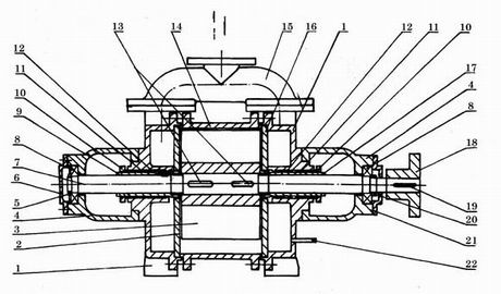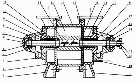 1.端蓋 2.后吸排氣園盤 3.葉輪 4.軸承架 5.園螺母 6.后軸承壓蓋 7.軸 8.軸承 9. 后軸套10.填料壓圈 11.填料 12.填料壓圈 13.平鍵 14.泵體 15.連通管 16.前吸排氣園盤 17.前軸套 18.聯軸器具 19.平鍵 20.園螺母 21.前軸承壓蓋