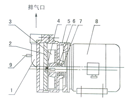 1、吸氣口   2、水環   3、排氣閥  4、排氣口   5、葉輪