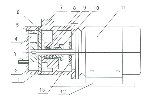 1、圓盤   2、泵蓋   3、進水管   4、葉輪  5、橡膠球   6、擋板   7、泵體 8、封液環   9、填料   10、填料壓蓋   11、電機  12、底盤   13、擋水圈